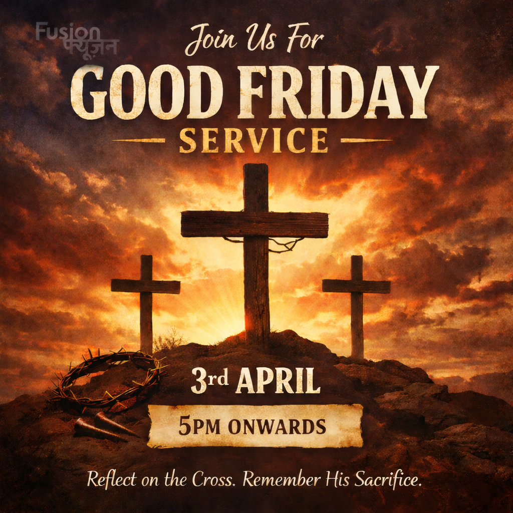 Join us this Good Friday as we remember the love and sacrifice of Jesus on the cross. Let us gather in reflection and worship as one church family. Venue: Fusion Time: 5 PM onwards Combined Service