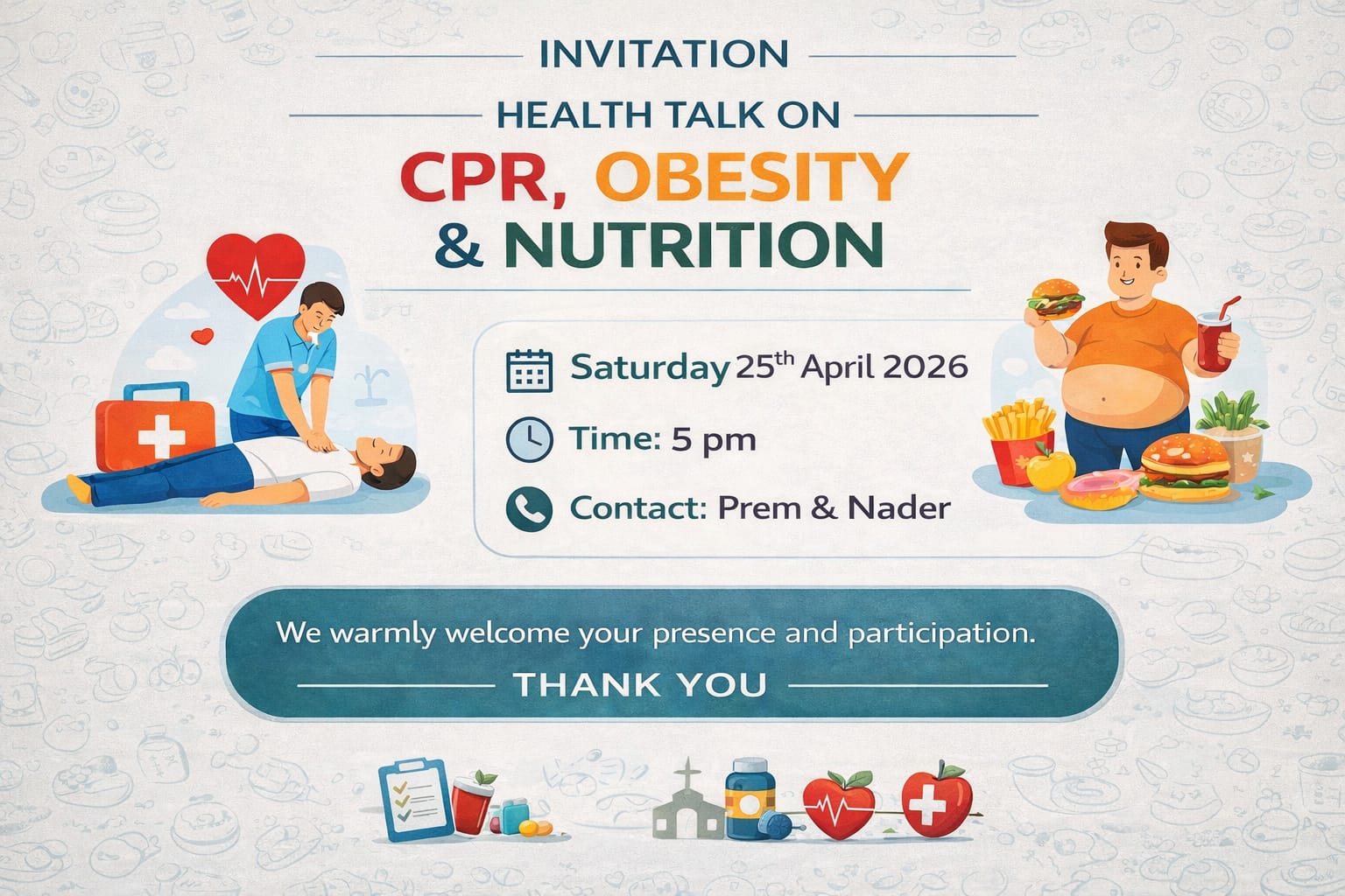 You’re invited to a Health Talk on CPR, Obesity, and Nutrition on Saturday, 25th April 2026 at 5 PM. This informative session aims to raise awareness about life-saving techniques, healthy living, and proper nutrition. Join us for an engaging and practical discussion, and feel free to reach out to Prem or Nader for more details—we look forward to your presence and participation.