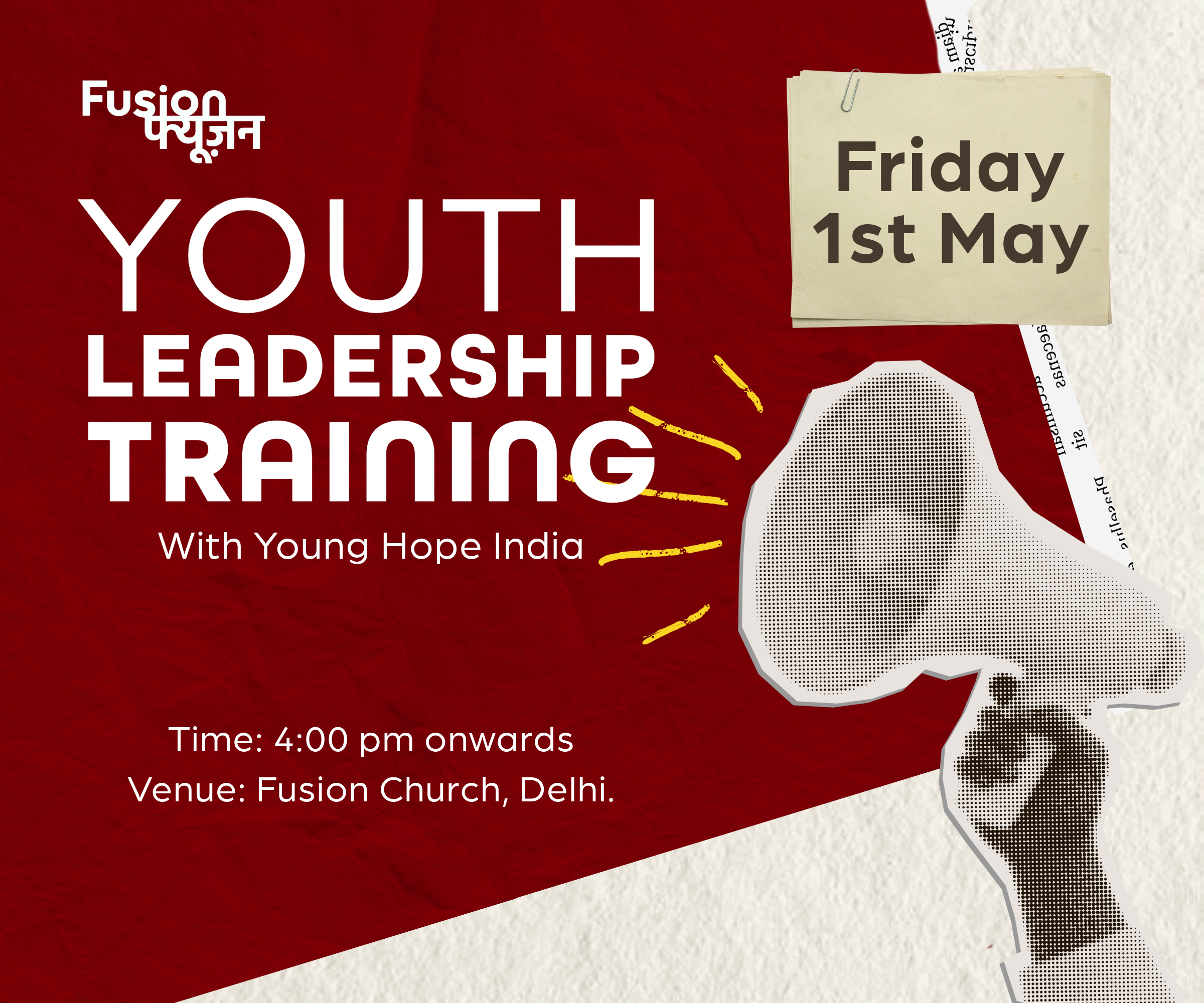 Fusion Church is hosting a Youth Leadership Training in collaboration with Young Hope India on Friday, 1st May, starting from 4:00 PM onwards at Fusion Church, Delhi. This event is designed to equip and inspire young individuals with leadership skills, vision, and purpose, creating an opportunity to grow, connect, and be empowered for future impact.